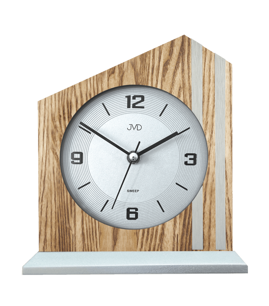 Moderné stolové hodiny v kombinácii dreva a kovu.